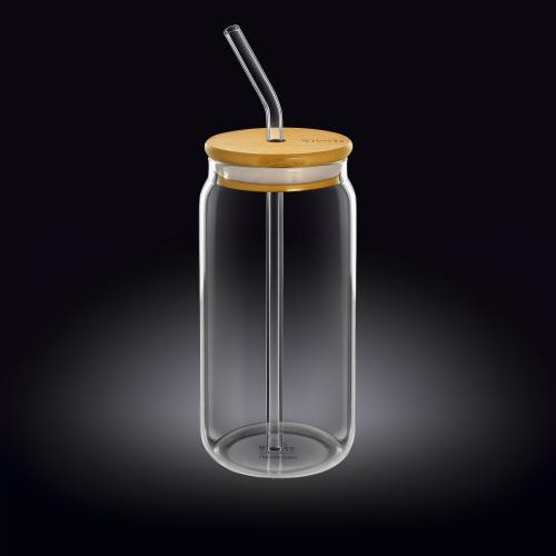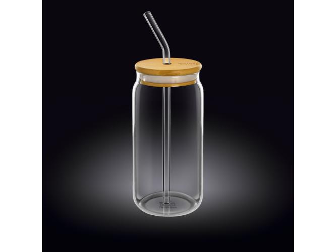 Банка для коктейля 500 мл. d=65 мм. h=160 мм с дерев. крышкой, с трубочкой Термостекло Wilmax /1/48/