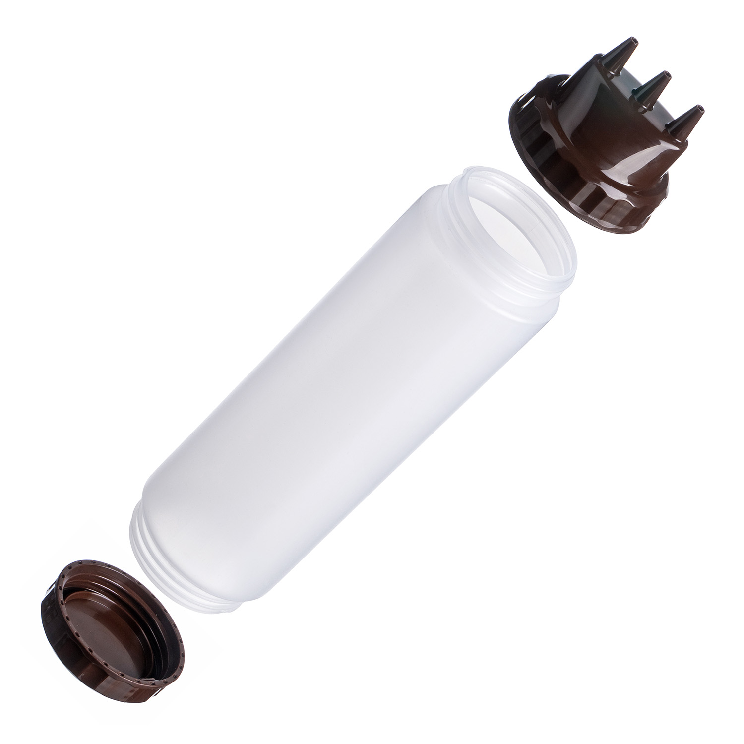 Емкость для соуса 1000 мл. d=75 мм. h=290 мм. c 2 крышками 3 носика, широкая прозрачная, крышки коричневые GP /1/96/