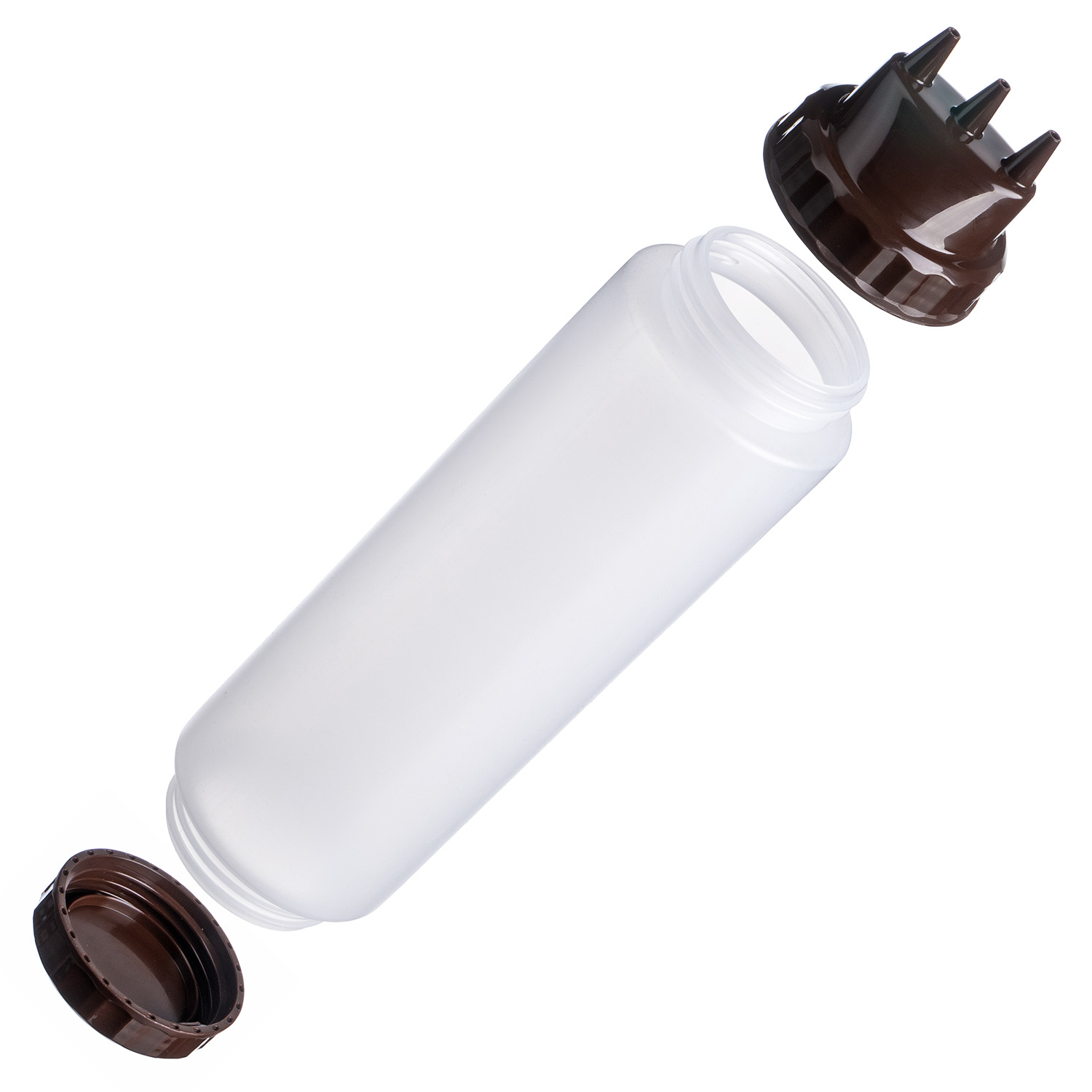 Емкость для соуса 750 мл. d=70 мм. h=270 мм. с 2 крышками 3 носика, широкая прозрачная, крышки коричневые GP /1/96/