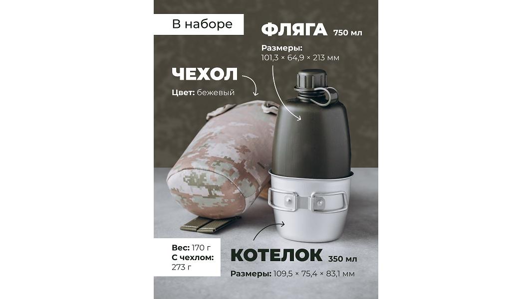 101,3*64,9*213 (фляга 750мл) 109,5*75,4*83,1 (котелок 350мл), вес 170гр, с чехлом 273гр. Фляга предназначена для содержания питьевой воды, котелок для приготовления кипятка. Материал: фляга полиэтилен, котелок: пищевой алюминий.