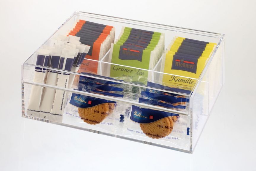 3 отсека для чайных пакетиков, 1 отсек для сахара, печенья.