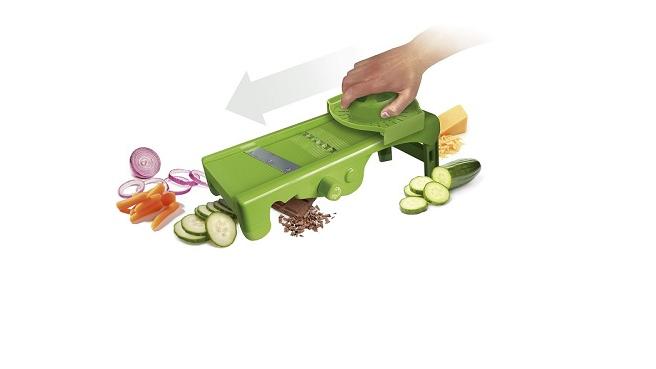 string(225) "32,8*16,4*9 см. 3 лезвия в комплекте, 8 видов нарезки, толщина от 1 до 9 мм, 6/9 кусков