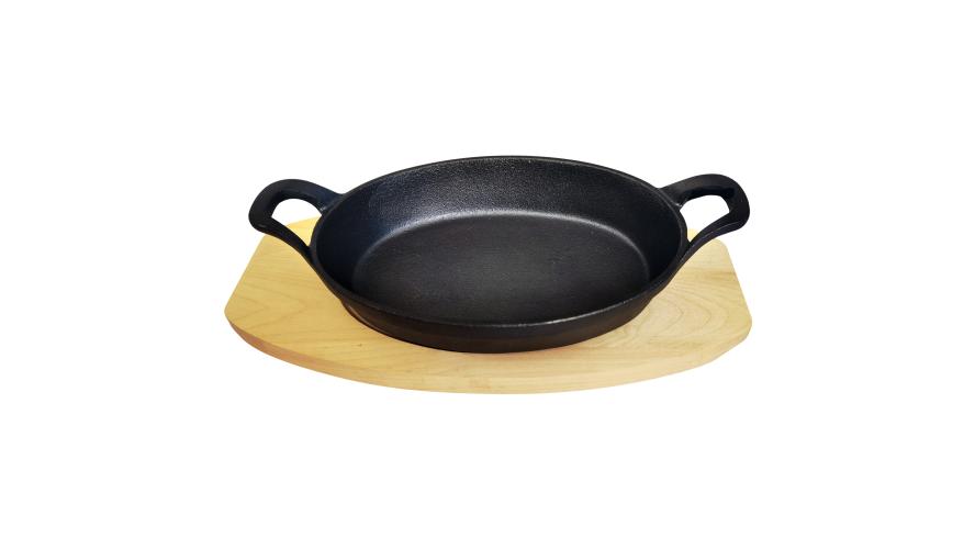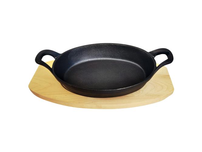 Сковорода порц. овальная 20,5*14,5 см. h=3,5 см. 0,75 л. чугун. с 2 ручками на дерев. подставке /1/
