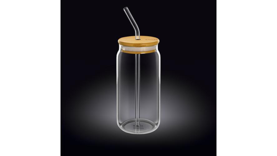 Банка для коктейля 500 мл. d=65 мм. h=160 мм с дерев. крышкой, с трубочкой Термостекло Wilmax /1/48/