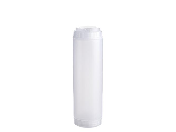 Емкость для соуса 750 мл выполнена из прочного пищевого пластика и предназначена для профессионального использования в сегменте HoReCa. Конструкция имеет две откручивающиеся крышки и съемный силиконовый клапан, что обеспечивает удобство наполнения, использования и ухода, а также позволяет дозировать содержимое без подтеков и экономит место для хранения. Прозрачный цвет служит универсальной маркировкой и облегчает визуальный контроль содержимого. Подходит для мытья в посудомоечной машине.
