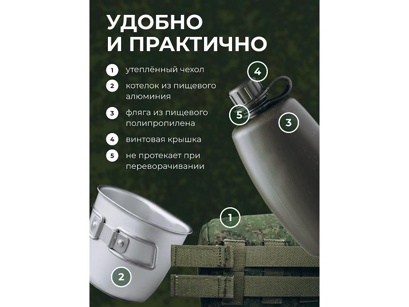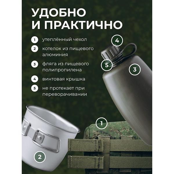 string(378) "101,3*64,9*213 (фляга 750мл) 109,5*75,4*83,1 (котелок 350мл), вес 170гр, с чехлом 273гр. Фляга предназначена для содержания питьевой воды, котелок для приготовления кипятка. Материал: фляга полиэтилен, котелок: пищевой алюминий.
