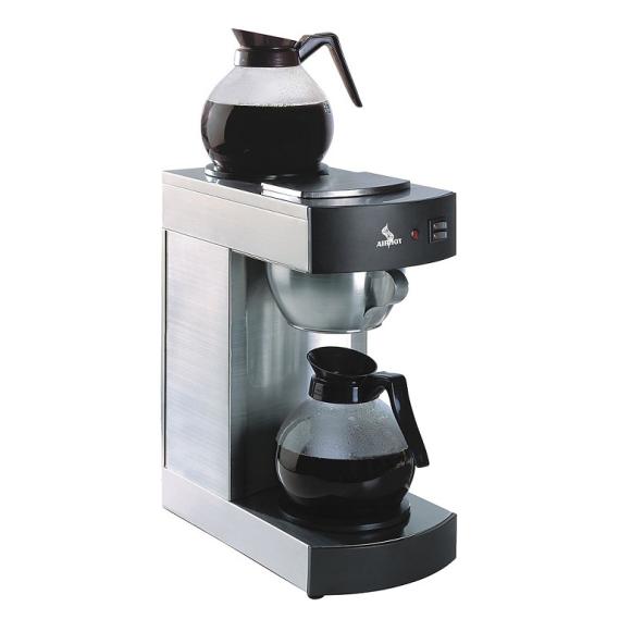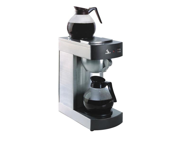 Кофеварка предназначена для приготовления кофе из молотых зерен. Оборудование изготовлено из нержавеющей стали. Модель оснащена подставкой для кофейника и нагревательной плитой, поддерживающей температуру приготовленного напитка. Кофейники, изготовленные из стекла и пластика поставляются отдельно. Объем кофейника 2,2 л.