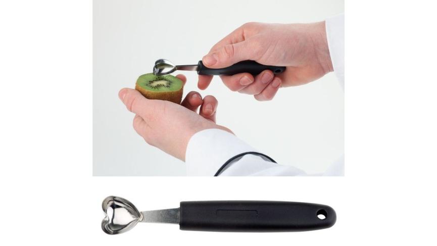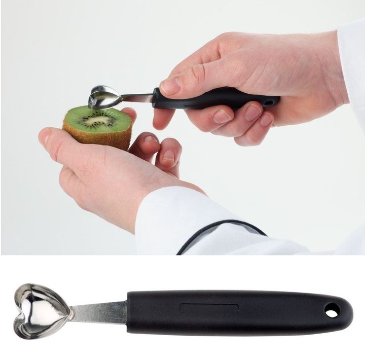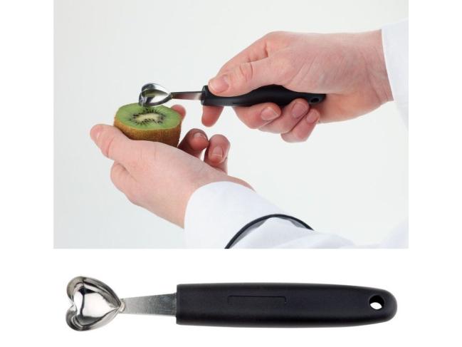 С помощью этой ложки, при вырезании из фруктов и овощей, получаются кусочки в виде сердечек.