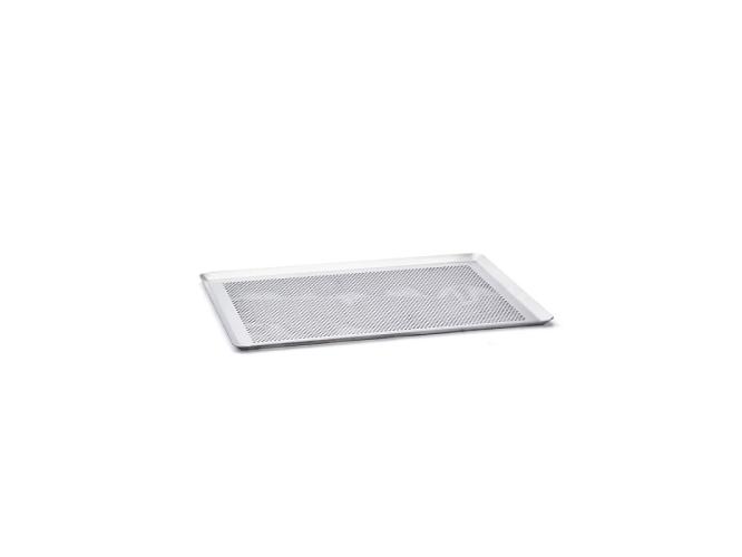 Микроперфорированный прямоугольный противень со скошенными краями, изготовленный из алюминия без покрытия.