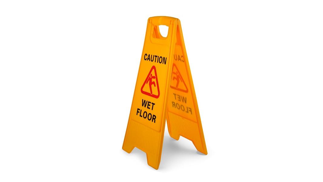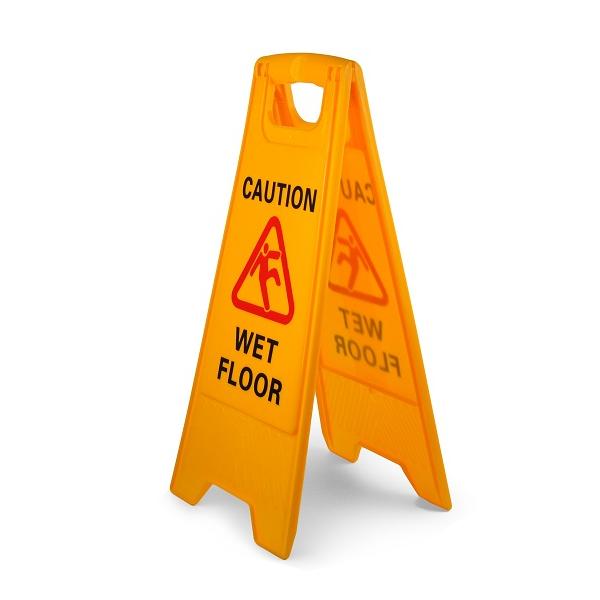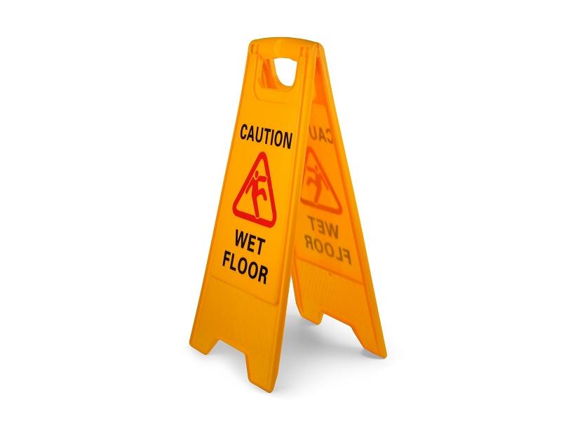 Также необходимо использовать знаки при проведении влажной уборки. Сочетание ярких цветов позволяет увидеть такие раскладные таблички на большом расстоянии.