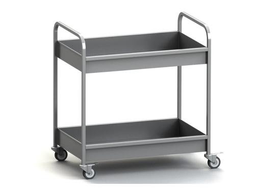 Тележка имеет 2 полки глубиной 100 мм. и 4 поворотных колеса с тормозом.